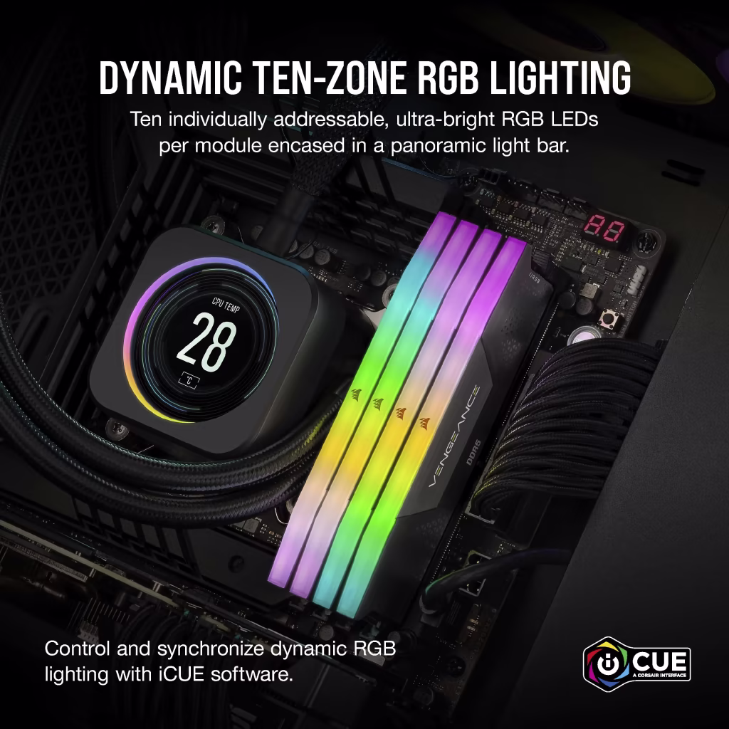 این رم از فناوری DDR5 بهره می‌برد که سرعت بسیار بالاتر، مدیریت انرژی بهتر و پهنای باند دوبرابری نسبت به DDR4 دارد. با استفاده از PMIC داخلی، پایداری ولتاژ و راندمان انرژی افزایش یافته و امکان اورکلاک پایدار فراهم می‌شود. نورپردازی RGB نسل جدید با 10 Zone LED قابل‌کنترل از طریق iCUE، جلوه‌ای زیبا و یکنواخت ایجاد می‌کند.